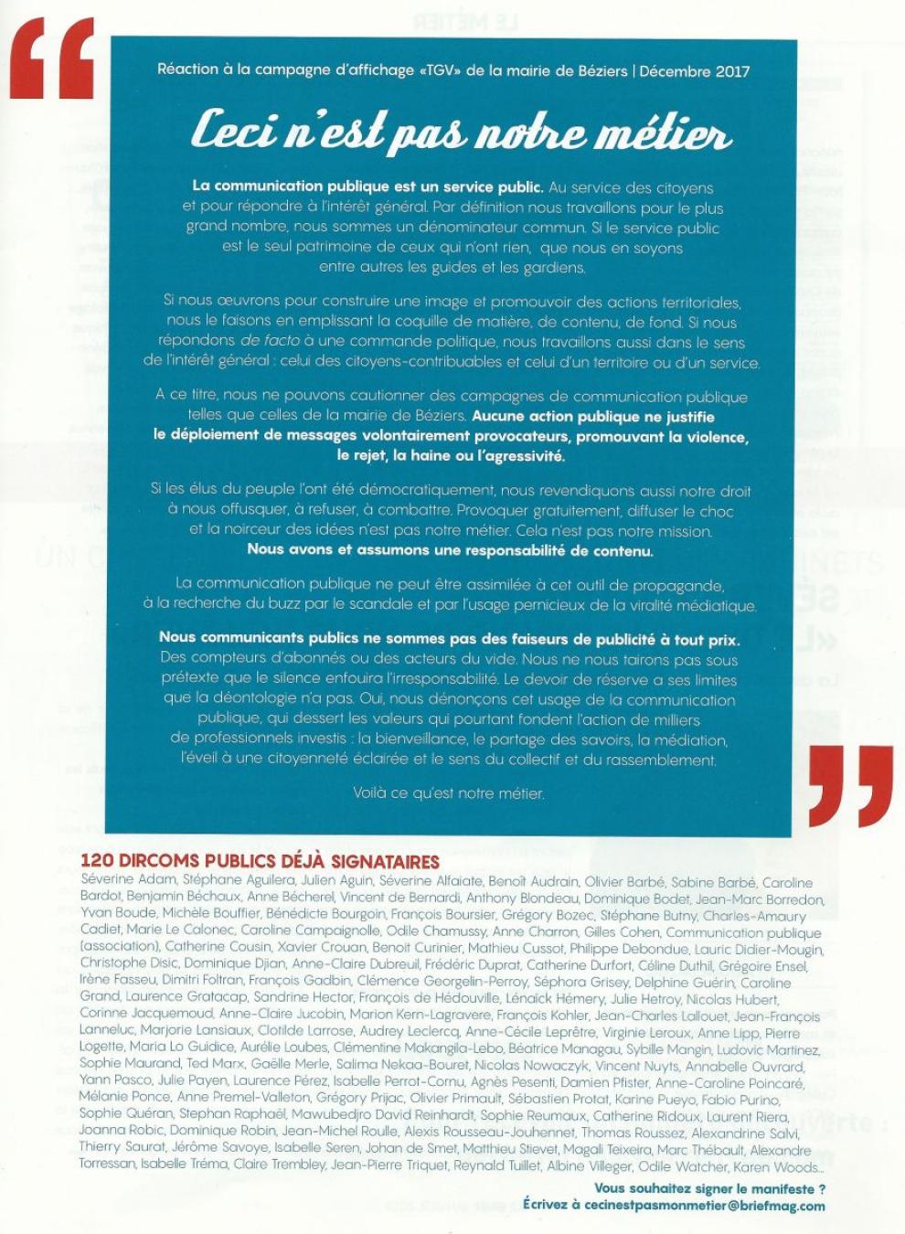 « La communication publique est un service public » rappellent les auteurs, reprenant en ouverture du texte la signature du réseau Cap’Com. « Nous ne pouvons cautionner les campagnes de communication publique telles que celle de la mairie de Béziers. Aucune action publique ne justifie le déploiement de messages volontairement provocateurs, promouvant la violence, le rejet, la haine ou l’agressivité ».