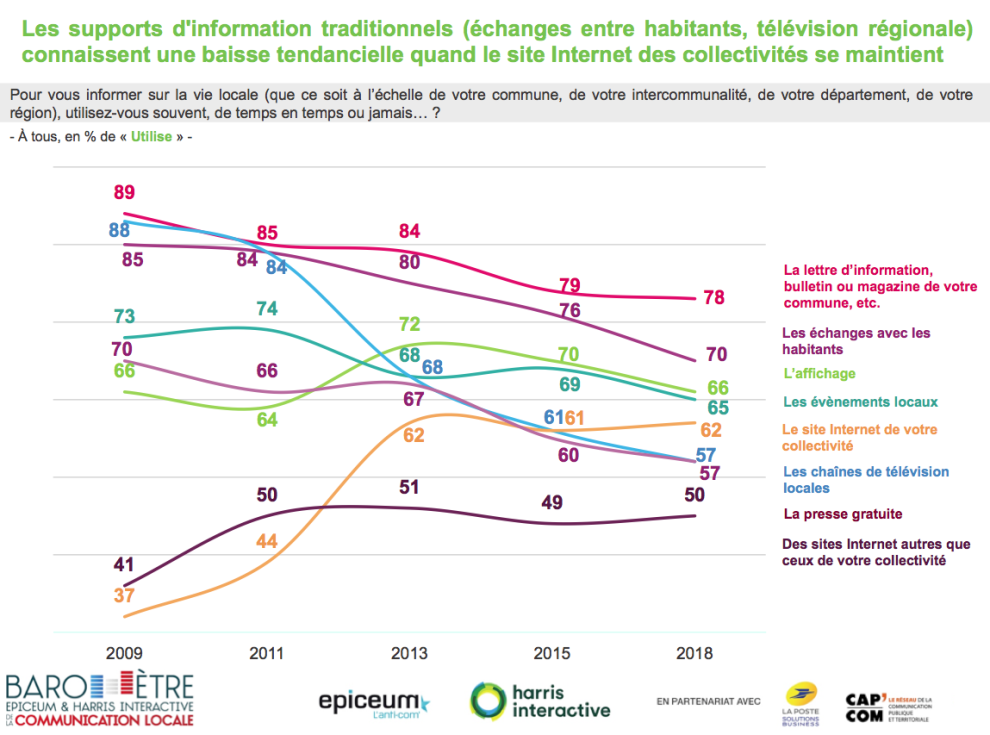 Les citoyens s’informent par plusieurs canaux de communication. En moyenne, ils utilisent 8,1 supports différents. Presse territoriale et locale, sites internet et réseaux sociaux, télévisions et radios locales, affichage, évènements, réunions publiques… Chaque émetteur, chaque support, répond à une attente.