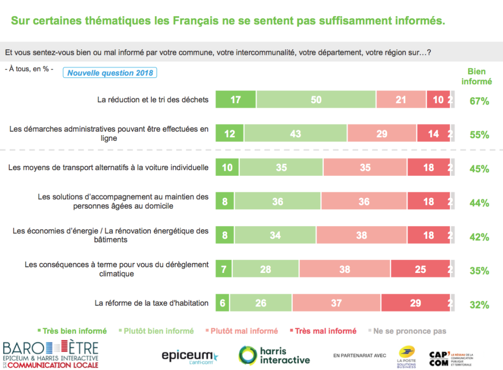 Interrogés plus précisément sur les sujets sur lesquels les Français se sentent bien informés par leurs collectivités, c’est le tri des déchets qui apparait comme le sujet le mieux couvert (67 % se déclarent bien informés), devant les possibilités de réaliser diverses démarches administratives en ligne (55 %). Sujet plus actuel et aujourd’hui assez flou, seulement 1 Français sur 3 se déclare en revanche bien informé sur la réforme de la taxe d’habitation (32 %). Notons par ailleurs que les publics les plus jeunes affirment en général être mieux informés que le moyenne sur ces sujets.