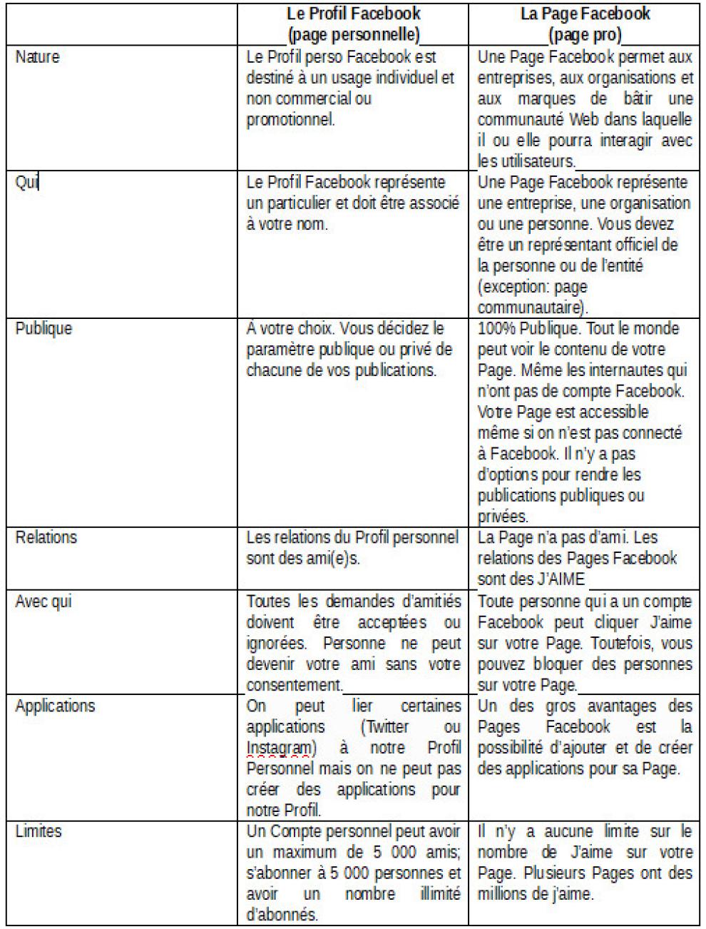 La page Facebook est donc à différencier du profil Facebook. Ce qui est permis par l’une n’est pas autorisé par l’autre. Un tableau synthétique permet d’identifier les différences importantes entre le Profil et la Page Facebook.