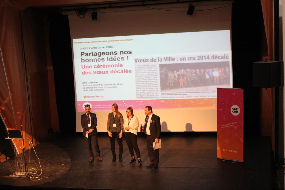 De trois communicants enfin, qui ont présenté en 10 minutes chrono des opérations de communication interne dynamiques : des vidéos façon « vis ma vie » avec un maire impliqué à Chatou, des films de cérémonies de vœux complètement décalées à Annecy, et l’organisation d’un service de colunching à Mulhouse.