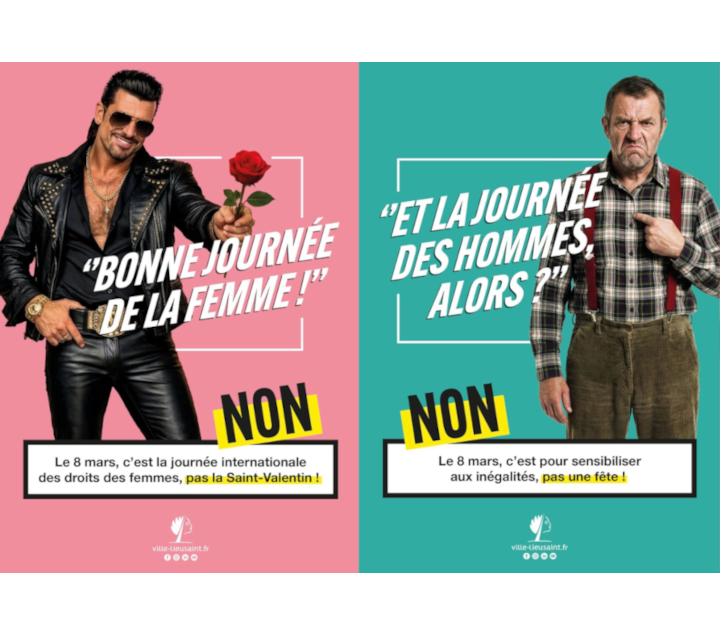 « À Lieusaint nous luttons avec humour pour expliquer ce qu’est la Journée internationale des droits des femmes, avec des personnages fictifs créés avec l’aide de l’intelligence artificielle. Des clichés grossiers et des punchlines caricaturales pour interpeller, mais toujours avec le sourire », précise Charlotte Fau, directrice de la communication de la ville, sur LinkedIn. On ne demande rien de moins que l'égalité. Une campagne énergisante !