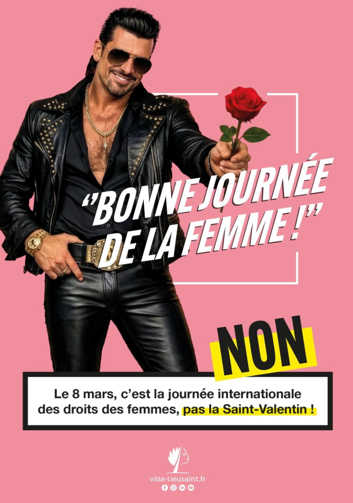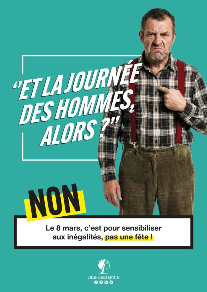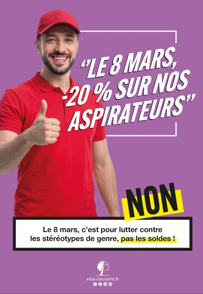 Cette année, la campagne de Lieusaint sort du lot avec trois affiches qui osent détourner les clichés entourant cette journée : « Le 8 mars n’est pas une fête, ni la Saint-Valentin, ni les soldes, mais un temps pour sensibiliser, prendre conscience et lutter contre les inégalités entre les femmes et les hommes. » Un postulat qui s’affiche comme un message de santé publique, à la manière des avertissements sur les paquets de cigarettes. Avec ses visuels flashy rappelant l'identité graphique des paquets de tabac, le message est-il subliminal ? « La bêtise et l'ignorance tuent » ?