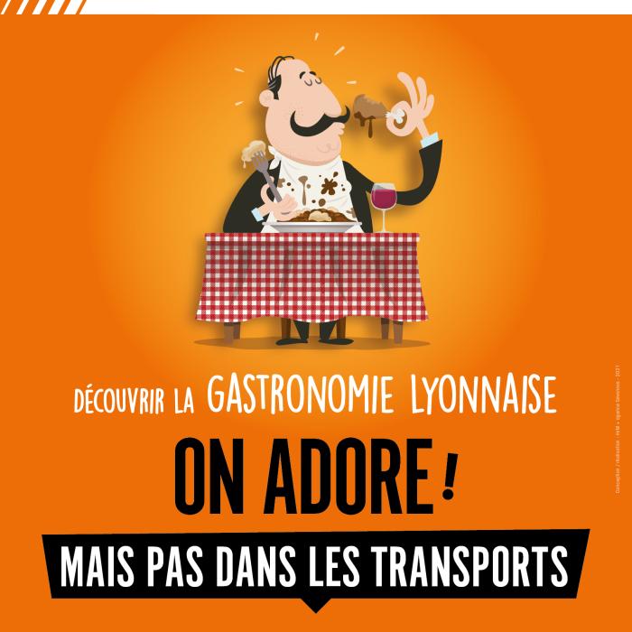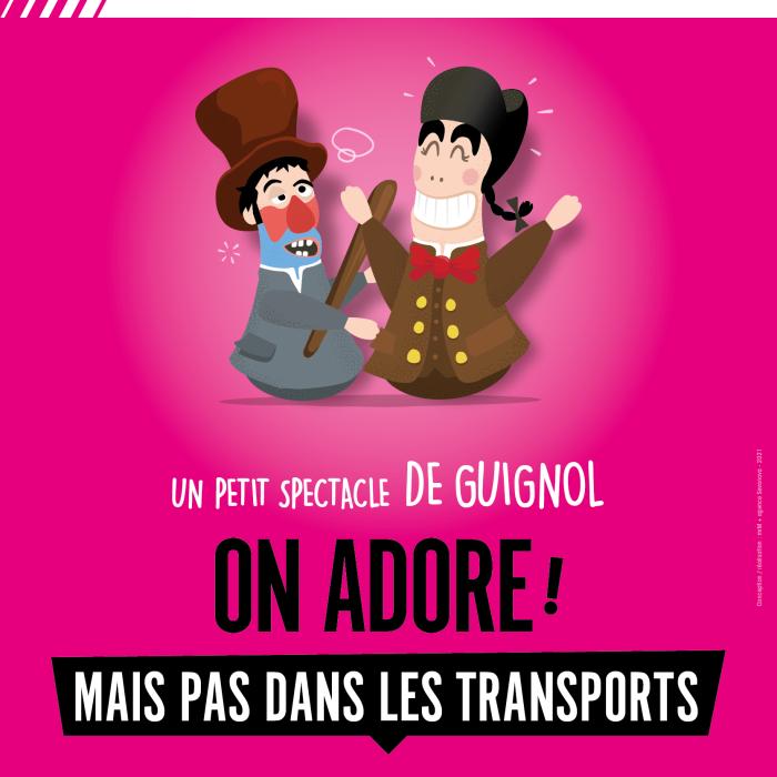 « Un petit spectacle de Guignol, on adore ! Mais pas dans les transports », « Une bonne poussée en mêlée au stade de Gerland, on adore ! Mais pas dans les transports », « Faire de la trottinette sur les berges, on adore ! Mais pas dans les transports ». Balades, sorties culturelles et sportives, festivals, réouverture des restaurants, la campagne lancée depuis début octobre 2021 dans les transports de la métropole lyonnaise met en parallèle ces moments de vie métropolitains retrouvés avec les comportements incivils à éviter. « Après dix-huit mois de confinement, avec moins de déplacements et moins d’interaction sociale, il semblait utile de faire un rappel des règles de savoir-vivre/être, mais aussi d'inciter à plus de bienveillance sur le réseau », explique Samantha Mech, chargée de communication et relations presse du réseau Transports en commun lyonnais (TCL).