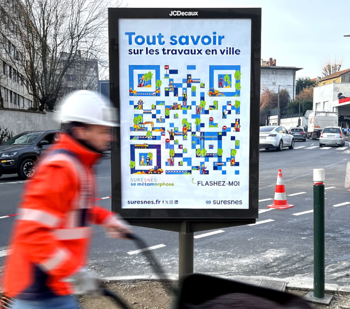 Pour sortir des campagnes traditionnelles sur les travaux, le graphiste de la ville, Norge Villalobos, soumet l’idée de créer un QR code original et illustré pour renvoyer vers une page du site web sur les travaux. Il propose d’habiller l’intérieur du carré avec des illustrations immédiatement identifiables – grues, engins, personnages casqués – mais aussi avec des arbres pour signifier la volonté de donner plus d'espace à la végétation et améliorer le cadre de vie des habitants. Ce changement vers une ville plus « verte » est également marqué par un dégradé du bleu – couleur du logo de la ville – vers le vert sur la baseline « Suresnes se métamorphose ». Seule une accroche sans jeu de mots ni mots en trop accompagne le QR code et cette baseline pour inciter tout de suite à flasher le QR code : « Tout savoir sur les travaux en ville. »