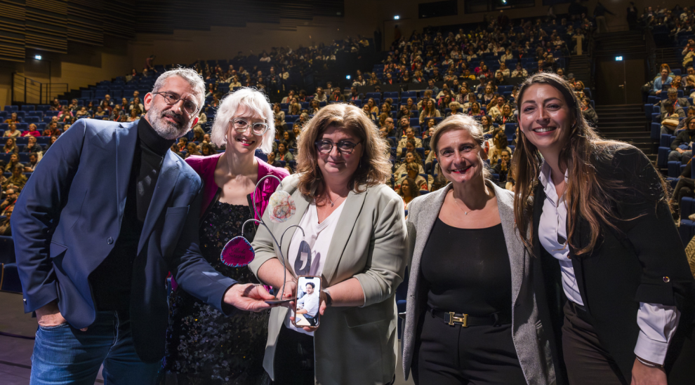 L'équipe de Suresnes recevant son prix Cap'Com : (de gauche à droite) Cyril Morteveille, dircom - Anne-Catherine Baechtel, responsable du pôle digital - Sophie Racle, dircom adjointe - Céline Karst, chargée de projets com, avec Fiona Kouassi du jury pro.