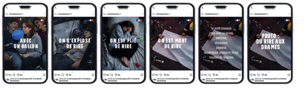 Le projet de loi Ripost prévoit de faire de l’inhalation de protoxyde d’azote hors cadre médical un délit passible d’emprisonnement et d’amende, et de punir la conduite sous son emprise. Cette réponse pénale s’accompagne d’une campagne de communication lancée le 7 avril sur les réseaux sociaux et, depuis le 12 avril, d'un film diffusé sur TF1, France Télévisions, M6 et sur les différentes plateformes digitales (TF1+, M6 replay, France TV replay, Prime vidéo).