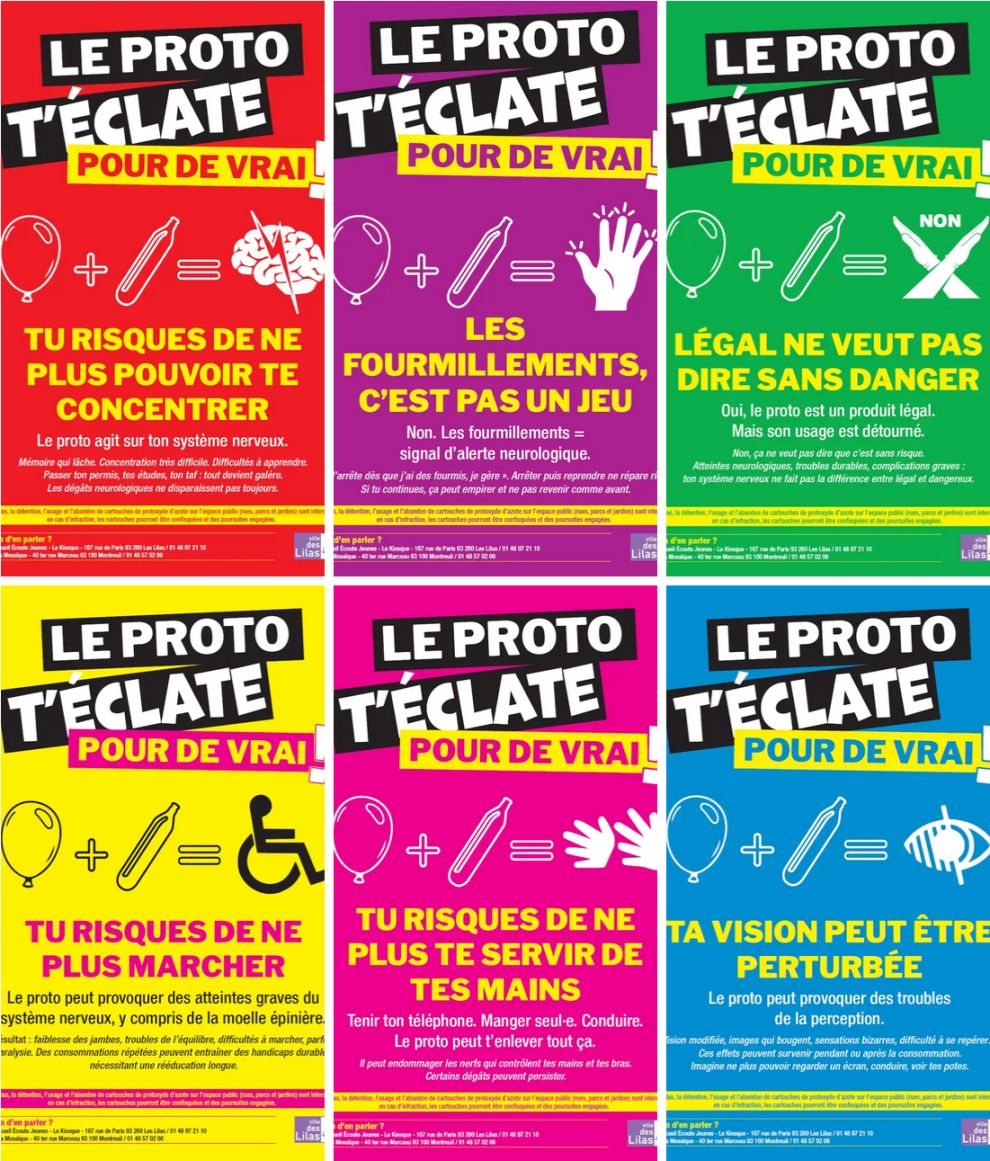 La ville des Lilas a décliné une série d’affiches avec le slogan « Le proto t’éclate pour de vrai ! » portant sur chacun des risques majeurs pour les consommateurs. La campagne veut responsabiliser celles et ceux qui seraient tentés par ce produit en montrant clairement les effets que son absorption peut entraîner.