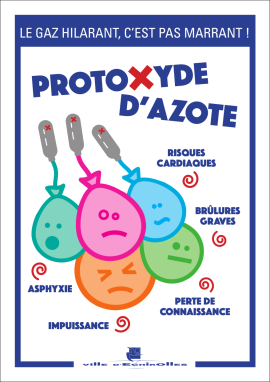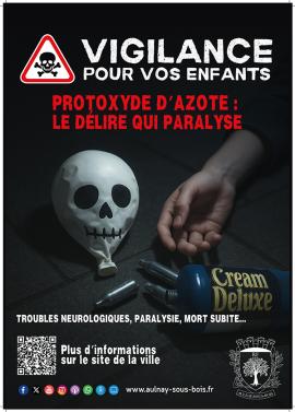 Depuis l’été 2019, la ville d’Aulnay-sous-Bois alertait les pouvoirs publics sur les dangers du protoxyde d’azote. À l’occasion de la rentrée 2020, une nouvelle campagne de prévention à l’attention des enfants, des jeunes et de leurs parents est développée. Cette campagne d’affichage et de sessions de prévention auprès des publics scolaires s’insérait, selon la ville, dans un contexte d’évolution des habitudes des plus jeunes.