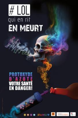 La ville de Stains a lancé une campagne de communication sur les dangers de la consommation de protoxyde d’azote en avril 2025. Une initiative qui s’est accompagnée de la mobilisation des équipes sur le sujet, et qui fut relayée dans le magazine de la ville en espérant que cette campagne de sensibilisation « fera prendre conscience des dangers ». Le visuel choc, renvoyant à la conséquence extrême de cet usage, vise à dramatiser le sujet.