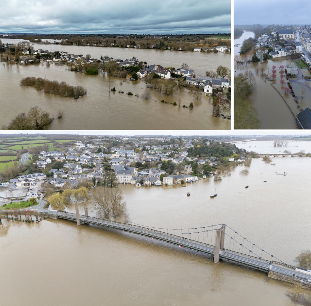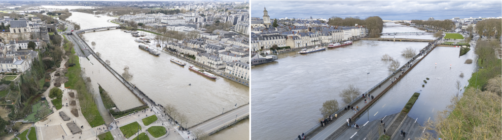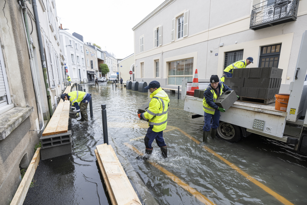 Le 21 février à Angers, la Maine passe le cap des 6,40 mètres. La ville ferme alors 50 sites et une ligne de tramway, réquisitionne deux gymnases et évacue un Ehpad. Pas moins de 4 kilomètres de planches en bois et 3 600 parpaings sont distribués par la municipalité pour aménager des passerelles et protéger les biens des habitants. La réserve communale de sécurité civile est activée, et les agents de la ville et de la communauté urbaine mobilisés pour porter assistance aux riverains.
