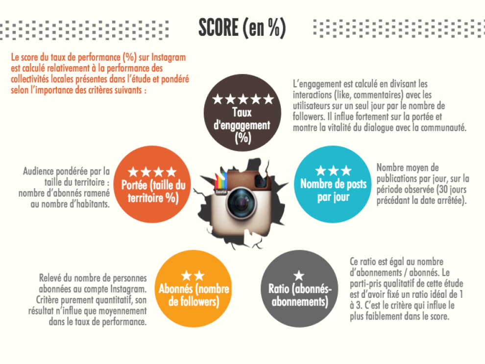 Car ces collectivités se distinguent par leur efficacité sur Instagram. Pour opérer sa sélection, le comité de pilotage de l'Observatoire a défini un « taux de performance » à partir d'une liste qualitative et pondérée de critères de performance (KPI). Cet algorithme unique a ainsi fait émerger les 5 à 10 collectivités les plus performantes sur Instagram par strate territoriale.