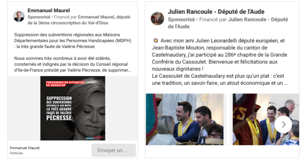 Alors, que trouve-t-on dans cette catégorie ? Tout d’abord, des publications d’élus ou de candidats. De la gauche à l’extrême droite, les élus ou listes sont nombreux à sponsoriser certains de leurs posts. Souvent pour de faibles montants, bien loin des sommes faramineuses que les politiques belges dépensent sur ces plateformes.