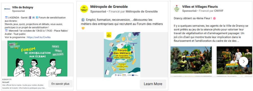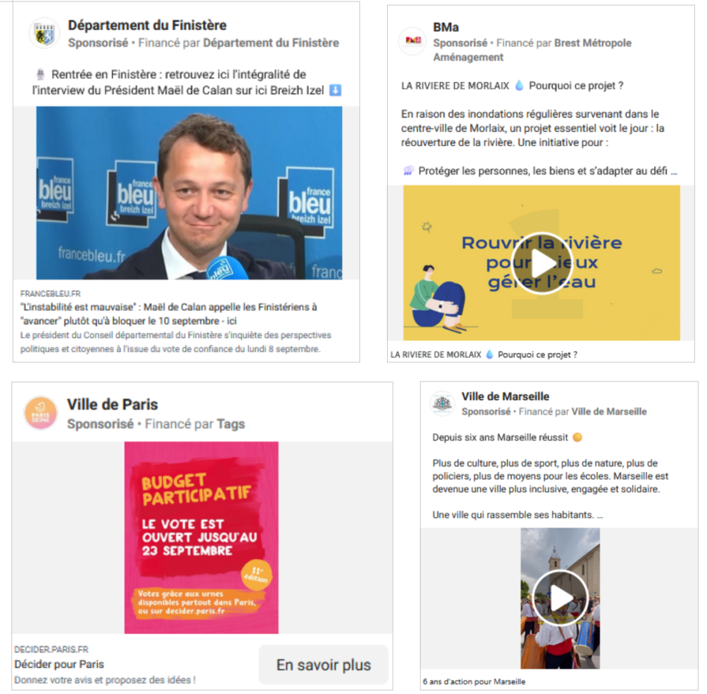 Enfin, en y regardant de plus près, on trouve également des publicités proposées par des collectivités. Quelques exemples qui demain pourraient disparaître : un bilan d’action municipale, l’annonce d’un projet pour le territoire, ou encore un appel au vote pour un budget participatif.