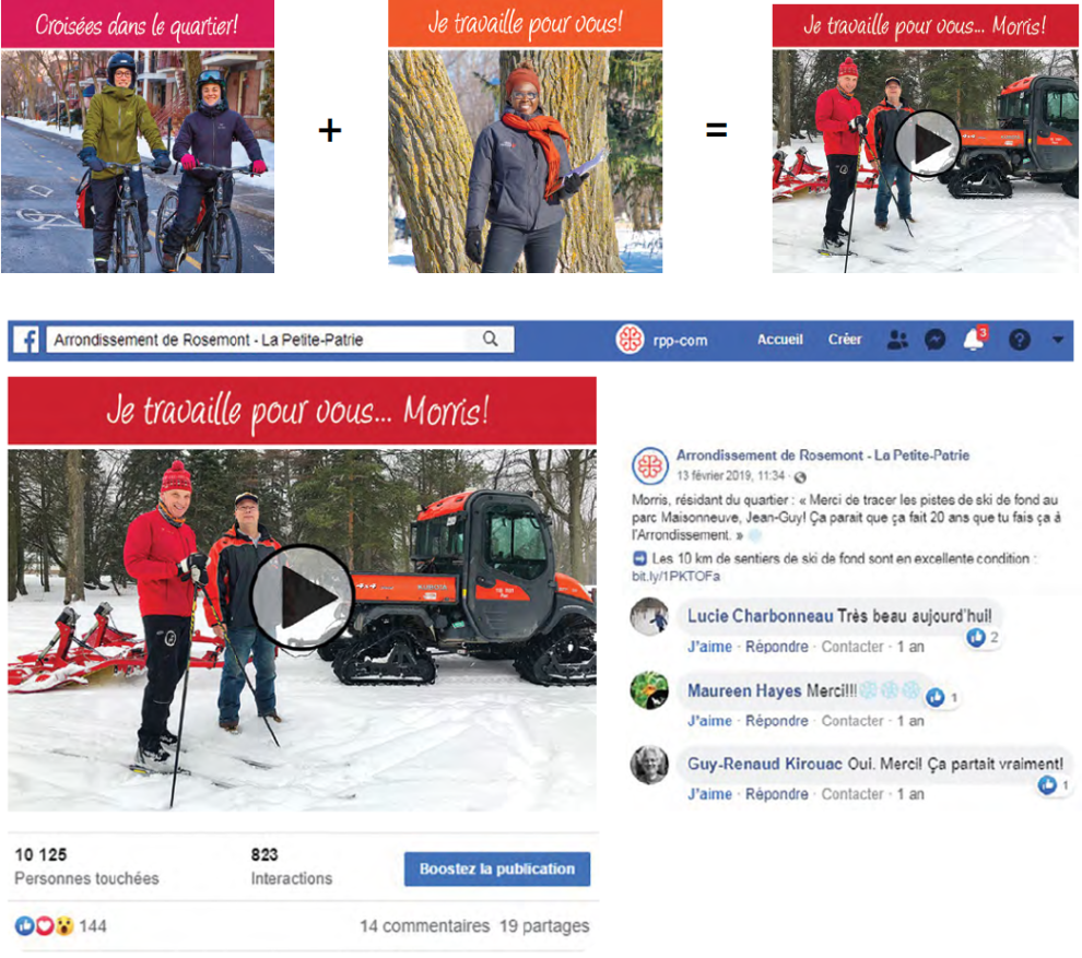 Pour développer une relation de proximité avec les citoyens et humaniser le message, les publications privilégient un message simple, clair et précis (je vous présente…), et focalisé sur la personne : utilisation du « je » dans le slogan de la campagne, et du prénom de l’employé. Le caractère authentique est sous-tendu par l’utilisation de la typographie Pine Nut tirée de la plateforme graphique de l’arrondissement, des couleurs dynamiques et les photos prises par la gestionnaire de communauté (community manager en français !). La campagne rebondit sur certains événements récurrents – publication d’une capsule « Elles travaillent pour vous ! » pour la Journée internationale des femmes, mise en valeur d’un couple d’employés pour la Saint-Valentin – et sur les rares commentaires mitigés pour contrer des idées préconçues.