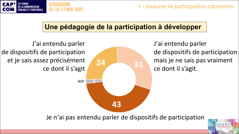 Un paradoxe qui fut débattu lors d’un grand débat du Forum de la communication publique à Strasbourg le 15 novembre 2022 avec Syamak Agha Babaei, premier vice-président de l’Eurométropole de Strasbourg et premier adjoint de la ville de Strasbourg, Dominique Djian, directrice de la communication de la Métropole de Lyon, Christian de la Guéronnière, directeur de l’agence Epiceum, Erwan Lecœur, sociologue, et Jean-Daniel Lévy, directeur de l'institut Harris Interactive. En effet, pour 29 % des Français les dispositifs de participation sont une très bonne chose et pour 61 % d’entre eux c’est une bonne chose. 20 % souhaitent leur développement, entre un quart et un tiers des habitants sont disposés à y participer. Mais ils sont peu nombreux à se sentir bien informés sur les concertations citoyennes organisées.