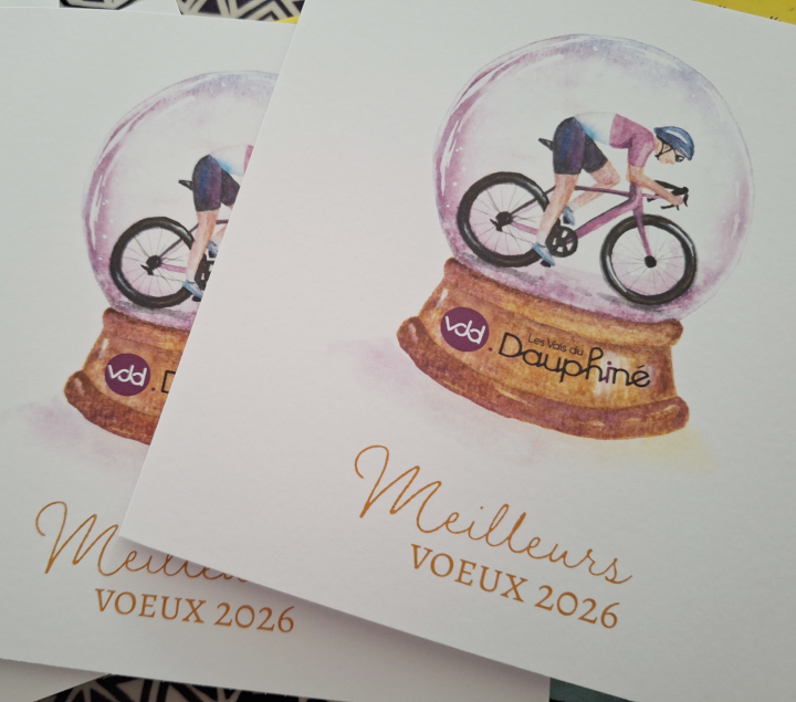 Au préalable, comme la forme compte tout autant que le fond, la question s’est posée de créer un visuel pour les vœux de ma collectivité, à la fois conventionnel en raison des règles préélectorales et original pour se démarquer. Sacré défi, me diras-tu, cher carnet ? C’est vrai, mais le brainstorming en interne au service a été fructueux : entre autres propositions farfelues, nous avons lancé l'idée d’un visuel représentant une boule à neige, dans laquelle se trouverait un cycliste – pour lier le message des vœux et la promotion des championnats de France de la discipline qui se dérouleront dans quelques mois sur le territoire. C’est alors que l'artiste du service a levé un regard pétillant en proposant de tenter le coup, non à la tablette graphique, mais à l’aquarelle. Ce à quoi j’ai répondu sans hésiter : banco !