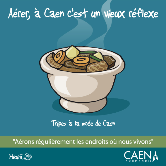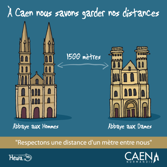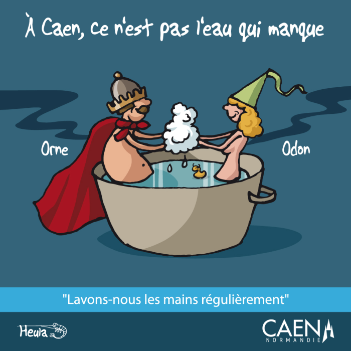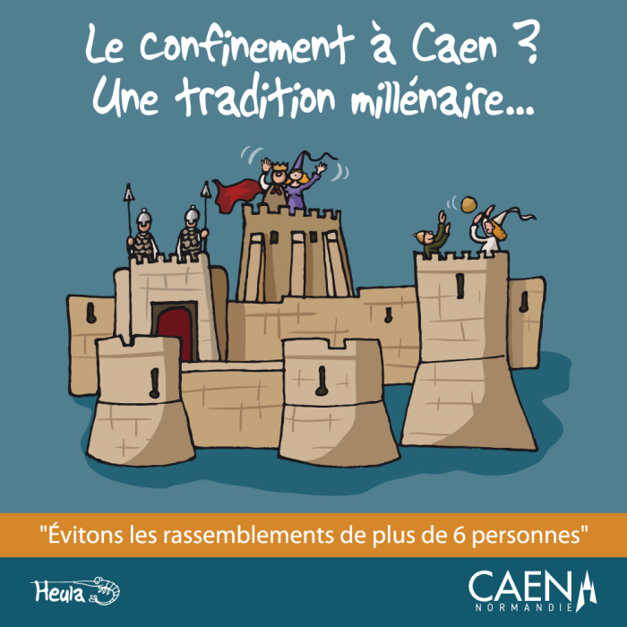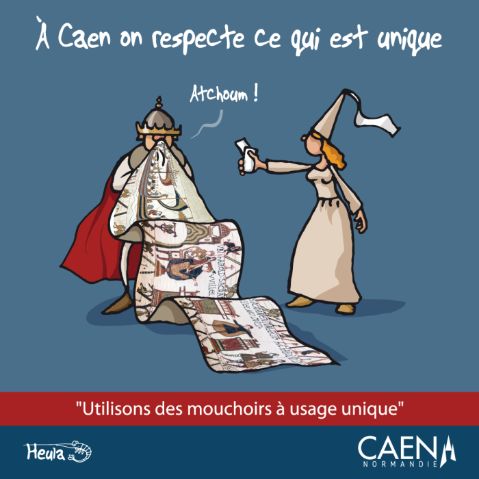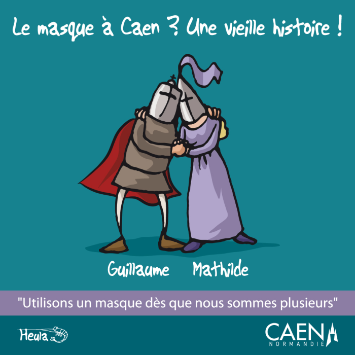 À la demande de la mairie, les dessinateurs de la marque se sont amusés avec les personnages historiques de la ville, ses monuments emblématiques, ses traditions culinaires, pour illustrer les gestes barrières et autres consignes sanitaires. Et le résultat ne manque pas d’humour et de second degré : « Aérer à Caen, c’est un vieux réflexe », peut-on lire au-dessus d’un dessin d'une assiette de tripes à la mode de Caen bien connues pour leur parfum typique. Guillaume et Mathilde, le couple historique « star », donne l’exemple en portant un masque. Même la tapisserie de Bayeux est mise à contribution pour inciter à l'usage des mouchoirs jetables !