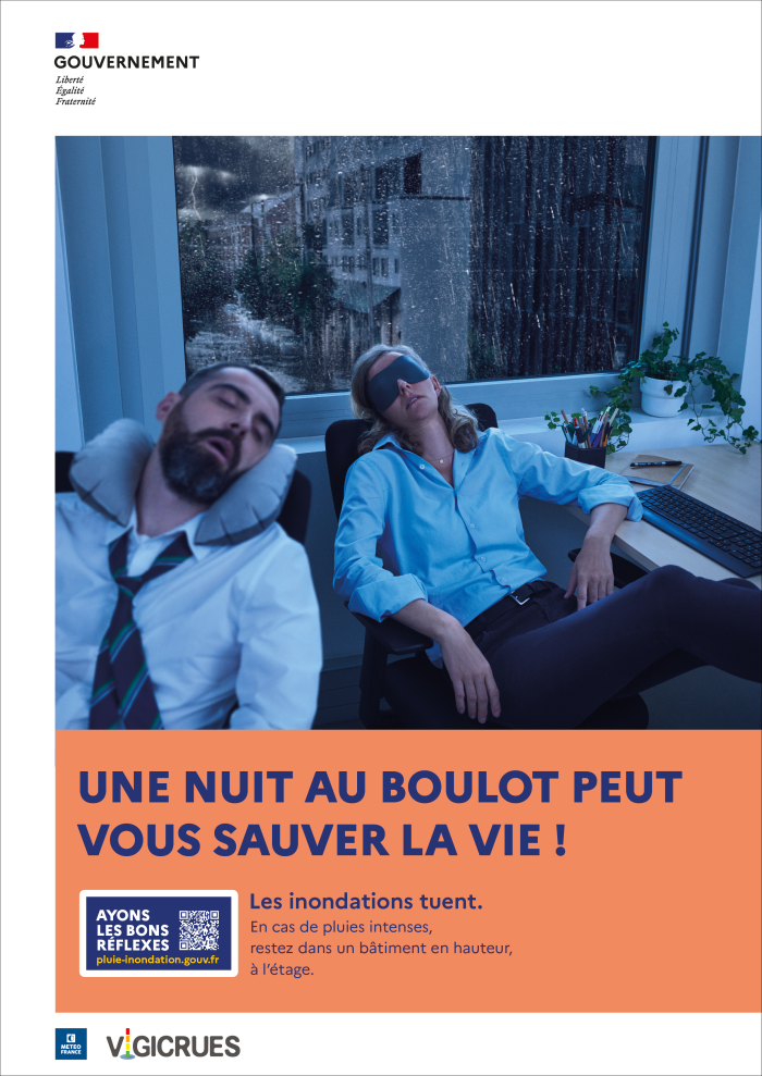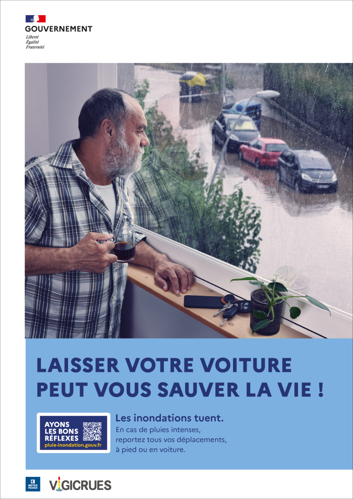 Sur les affiches de campagne, les logos de Météo France et Vigicrues rappellent l'existence de ces deux dispositifs pour être prévenu d’un risque de pluie intense et/ou d’inondation. La campagne incite également à préparer son kit d’urgence 72h, qui permettra de vivre de manière autonome durant trois jours en cas de phénomène méditerranéen.