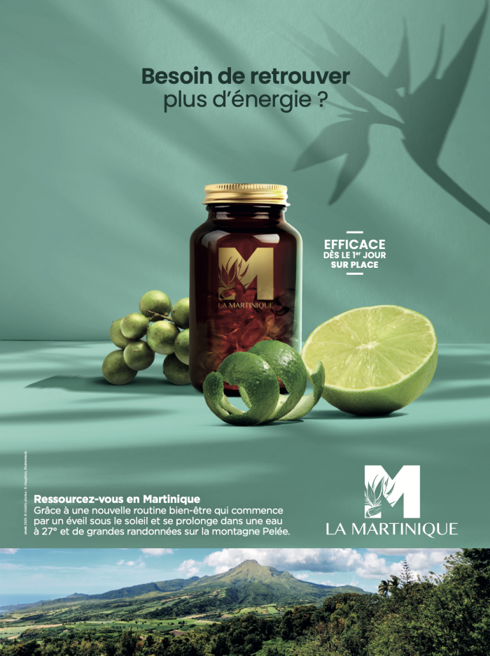 C'est une première ! Marie Claire, ELLE, Fémina ou Madame Figaro... Si Vitamine M s'affiche aux côtés d'autres produits de beauté dans la presse féminine, c'est pour se démarquer des destinations de rêve faisant appel aux filons classiques de séduction (plages, couchers de soleil…). La Martinique préfère miser sur ses atouts à la fois pour le corps et l'esprit. « Peau sans éclat et teint voilé ? Révélez votre vraie nature en Martinique », « Fatigué d'avoir l'air fatigué ? Retrouvez tout votre éclat en Martinique », « Besoin de retrouver plus d'énergie ? Venez vous ressourcer en Martinique ».