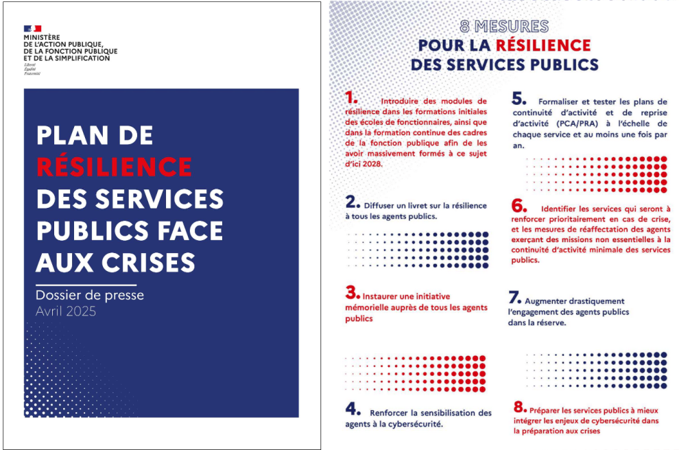 La résilience du service public est sa volonté et sa capacité à résister aux conséquences d’une agression ou d’une catastrophe majeure pour rétablir rapidement sa capacité de fonctionner normalement dans une situation nouvelle. Pour cela, selon le ministère de l’Action publique, il est indispensable de restaurer un esprit de défense auprès de tous les agents publics et de préparer opérationnellement les agents de terrain et les cadres de la fonction publique aux situations de crise. Un premier plan de résilience des services publics a été présenté en ce sens le 30 avril 2025.