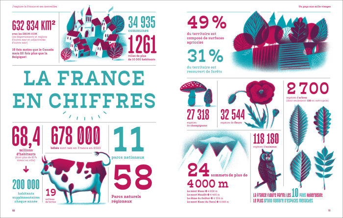 L’ouvrage de 208 pages, écrit par Justine de Lagausie et illustré par Mélody Denturck et Alex Viougeas, invite les jeunes lecteurs à se balader en métropole et dans les outre-mer pour découvrir la diversité des paysages de la France, la richesse de sa faune et de sa flore, son patrimoine architectural et culturel, ses traditions et arts.