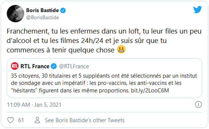 2021 débutait par un long week-end et je trouvais que c’était drôlement bien après cette année 2020 chaotique et confinée. Souvenez-vous, on critiquait déjà la campagne de vaccination contre la covid-19 qui commençait mollement, les chiffres tombaient, minuscules comparés à l’effort attendu, on en riait jaune sur les réseaux sociaux. Et puis la nouvelle s’est affichée sur mon fil Twitter le 4 janvier (un lundi, forcément) : 35 citoyens tirés au sort se pencheraient sur le berceau de la stratégie vaccinale naissante, la suivraient de près et donneraient leurs recommandations, « reflétant les positions en présence au sein de la société française ».