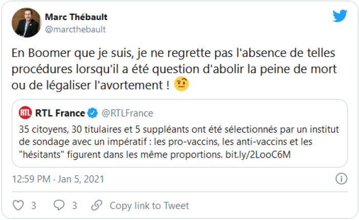 D’autant plus que la semaine passant nous avons appris que ces 35 citoyens seraient en fait sélectionnés, et non tirés au sort, par un institut de sondage avec un impératif précis : pro-vaccins, anti-vaccins et hésitants dans les mêmes proportions.