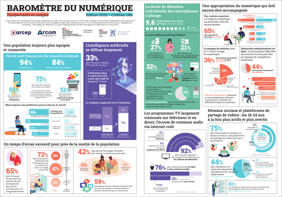 Le Baromètre du numérique du Centre de recherche pour l'étude et l'observation des conditions de vie (Crédoc) confirme qu’aujourd’hui presque l’intégralité de la population française de plus de 12 ans est équipée de smartphone et qu’en moyenne le temps d’écran représente un quart du temps éveillé. Il mesure aussi les difficultés que rencontrent les Français dans leurs démarches administratives en ligne.