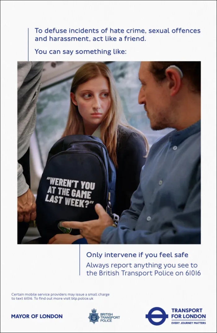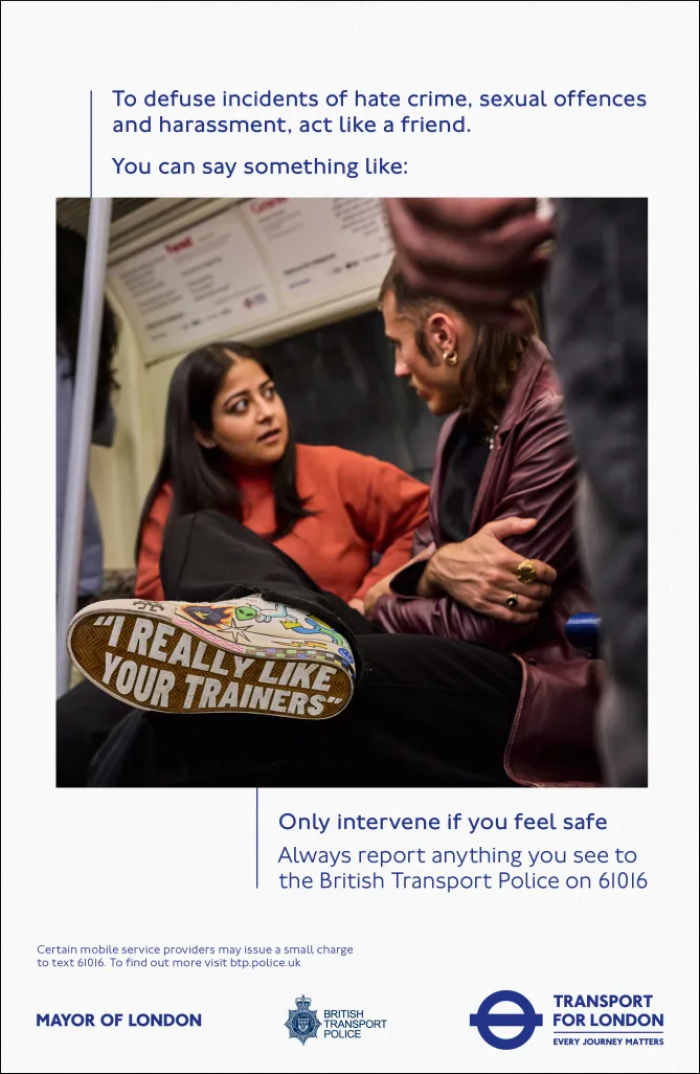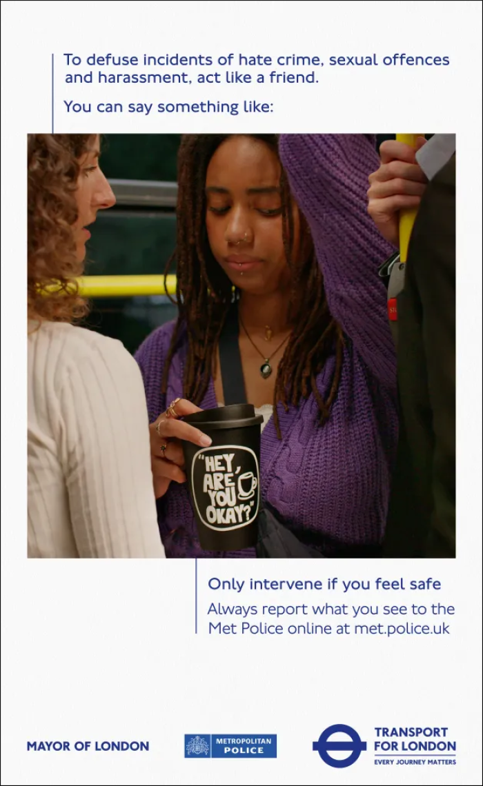 « Plutôt que de détourner le regard, les gens devraient s'approcher de la victime, faire comme s'ils étaient de vieux amis et engager la conversation, dissuadant ainsi les prédateurs de continuer », expliquent sur la BBC les responsables de Transport for London (TfL). Pour faire passer le message, TfL a confié la réalisation de sa campagne choc à l'agence VCCP et à l'équipe Wavemaker de WPP Media, avec notamment un film réalisé par le jeune et prometteur Edem Kelman.