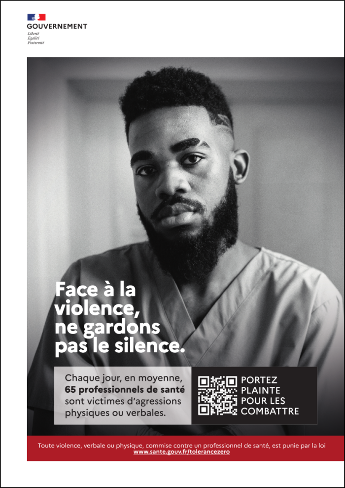 Trois autres visuels exclusivement à l’attention des professionnels de santé ont pour accroche « Face à la violence, ne gardons pas le silence » avec un QR code pour porter plainte en cas d’agression.
