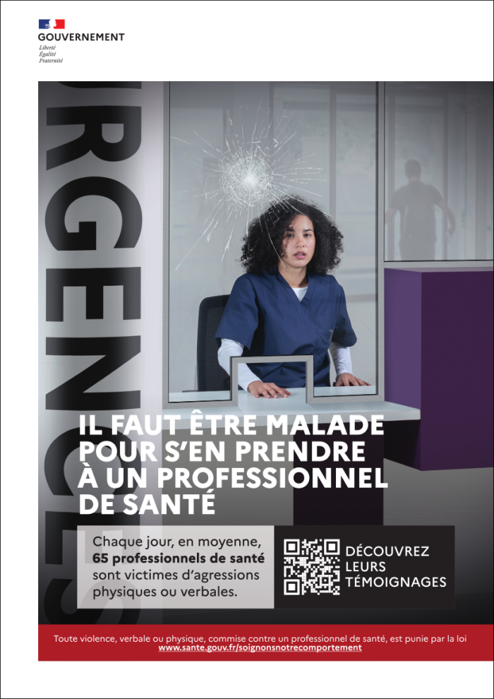 Les chiffres de l’ONVS (Observatoire national des violences en santé) sont effroyables : 20 000 signalements de violence, 30 000 atteintes aux personnes et 5 000 atteintes aux biens. Cette campagne, qui vise à ce que la crainte change de camp, rappelle que les auteurs de ces faits (physiques, verbaux, vol et/ou dégradation) s’exposent à de lourdes peines (de 7 500 à 75 000 euros) avec risque d’emprisonnement.