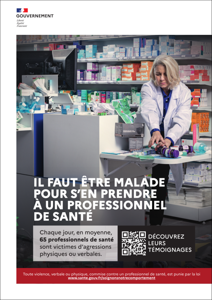 Quatre affiches sont à l’attention du public : une infirmière agressée aux urgences, un médecin violenté dans son cabinet, une pharmacienne dont l’officine a été dégradée et une secrétaire médicale insultée. À chaque fois, cette accroche cinglante : « Il faut être malade pour s’en prendre à un professionnel de santé ». S‘ajoute un QR code invitant à écouter des témoignages.