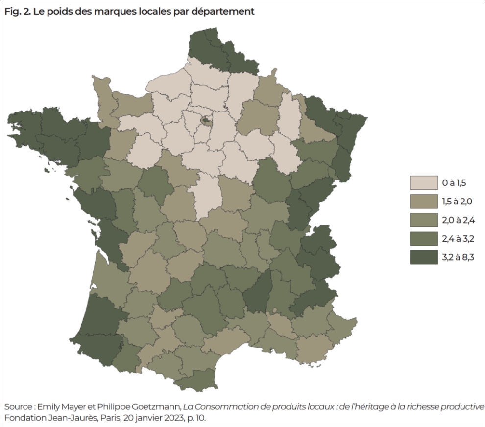 The identity and cultural factor plays an important role in the performance of local consumption. The importance of “local brands”, i.e. brands that generate over 50% of their sales in the same department (as a percentage of the revenue generated by mass consumer goods).