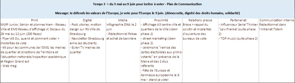 Pour inciter les citoyens à s’inscrire sur les listes électorales et à voter aux élections européennes, l’eurométropole de Strasbourg met en place une campagne cadencée, multicanale et d’envergure. S’appuyant sur un visuel pop art moderne et percutant ainsi que sur tous les supports disponibles (print, web, réseaux sociaux, terrain, événementiel, habillage de rames de tramway, etc.), elle accompagne la cadence des élections avec deux premières étapes incitant à s’inscrire sur les listes et une dernière étape qui met en avant les valeurs de l’Europe pour inciter au vote. Une opération de grande ampleur et d’une efficacité redoutable, avec un taux de participation au scrutin supérieur de 7 points par rapport aux précédents ainsi qu’un taux d’inscription sur les listes électorales qui augmente fortement avec la campagne et qui est très largement supérieur à ce que la collectivité avait enregistré en 2019..