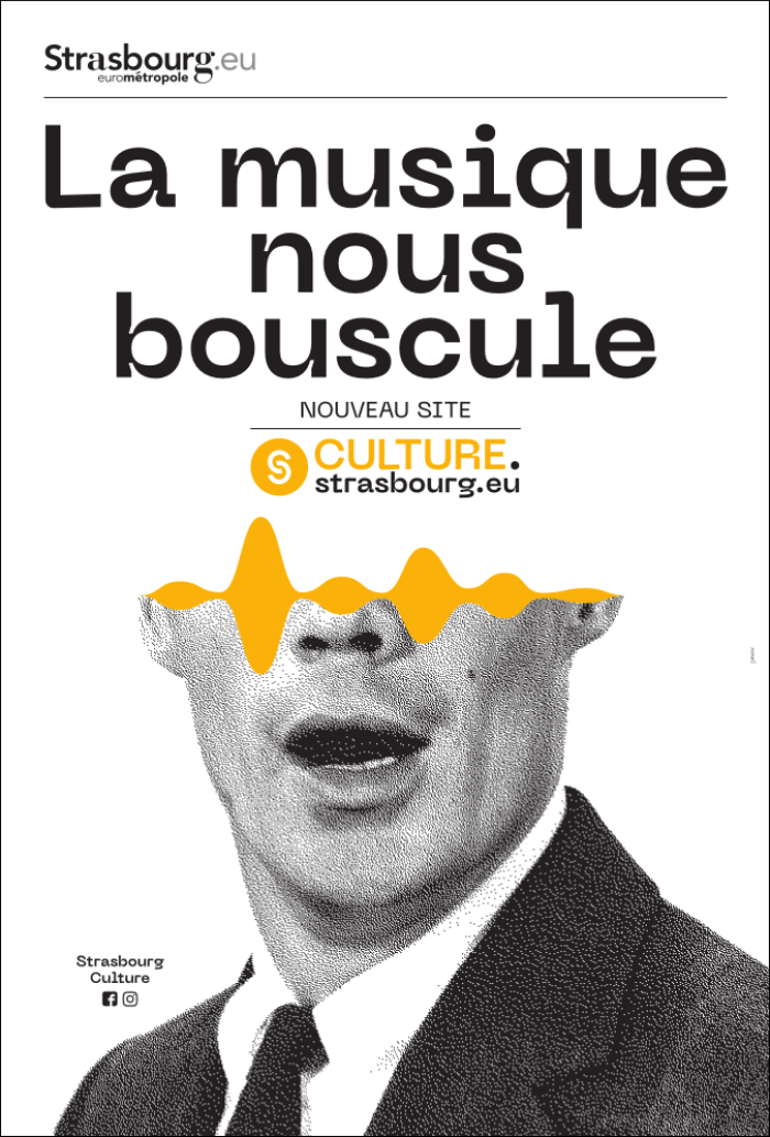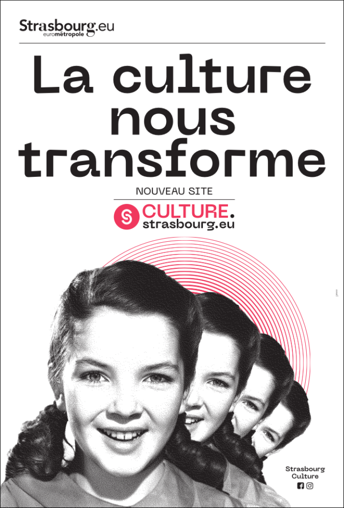 La campagne institutionnelle de la Ville et l’Eurométropole de Strasbourg pour valoriser sa politique culturelle s’est appuyée sur le pouvoir transformateur de la Culture dans notre société. Pour toucher tous les publics dans ses pratiques et affinités culturelles, le slogan principal de LA CULTURE NOUS TRANSFORME se décline en saga autour de 7 thématiques pluridisciplinaires de la culture.