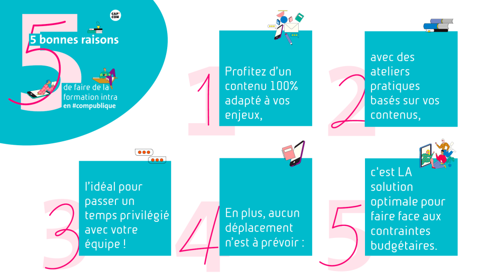 Sur votre demande et à partir de l'analyse de vos objectifs, Cap'Com élabore des programmes de formation-action sur mesure au sein de votre structure ou en ligne : thématique approfondie, développement de compétences collectives, appropriation d'outils et de méthodologies partagées, cohésion d'équipe, harmonisation des pratiques.