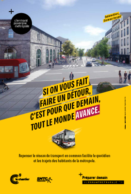 Pour informer et désamorcer les tensions liées aux grands chantiers métropolitains (transports en commun, eau, schéma cyclable, végétalisation et extension du réseau de chaleur urbain) qui se sont ouverts en 2023, Clermont Auvergne Métropole lance un dispositif de communication au message agile qui met en avant les bénéfices tangibles des travaux en cours tout en faisant preuve d’empathie pour les habitants affectés. La campagne se déroule en cinq étapes, définies selon les champs d’action couverts par les travaux. Pour chacune, visuels et dossiers détaillés sont diffusés via un plan média multicanal : relations presse et événements, affichage grand format, achat d’espace, web et réseaux sociaux. Une opération structurée et au message clair qui ouvre un récit sur le long terme ainsi que des perspectives d’évolution.