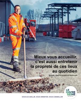 Dans le cadre de l’évolution des compétences et des métiers des agents des anciennes déchetteries – devenues centres de recyclage –, Le Havre Seine Métropole met en place une action de mise en valeur par la photographie, pour améliorer la connaissance et la perception de ces métiers. Traitées de manière réaliste et artistique, les photos sont associées à un message de bonnes pratiques porté par l’agent expert, contribuant ainsi à la valorisation de l’agent et à la bonne compréhension de ses missions. Le dispositif est affiché de manière pérenne sur sites, fait l’objet d’une exposition dans les locaux des agents et d’un livre photo à destination de la communauté de travail. Une campagne qui favorise la fierté et la reconnaissance, tout en portant des messages clairs pour l’évolution des pratiques et du regard des usagers.