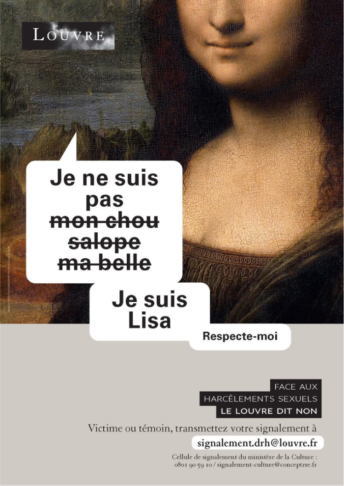 Dans un contexte global de structuration et d’organisation des acteurs RH pour prévenir les violences sexistes et sexuelles, former les agents et améliorer les signalements, le musée du Louvre met en place une large campagne de sensibilisation à destination de l’ensemble du personnel. S’appuyant sur les œuvres et les codes graphiques du musée, les visuels déployés mettent en avant différentes situations de violence ou de harcèlement, et visent à promouvoir la cellule de signalement. Une campagne cohérente, audacieuse et efficace.