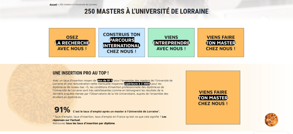 Pour la première fois, l’établissement a souhaité communiquer vers les étudiant·es au niveau national sur l’ensemble de ses masters. Cette campagne a un objectif de notoriété clair afin de promouvoir l’offre de formation au-delà de la région, qui peut être méconnue, ainsi que de valoriser l’excellent taux d’insertion (+91% après un master). L’objectif sous-jacent est également de compléter les données INSERSUP dont les critères ne prenaient pas en compte certaines spécificités de l'Université de Lorraine : une université formant des étudiant·es qui travaillent ensuite à l’international et dans la Grande Région (Luxembourg, par exemple) ou encore l'université la plus entreprenante de France avec près de 5 000 étudiant·es entrepreneur·es formé·es