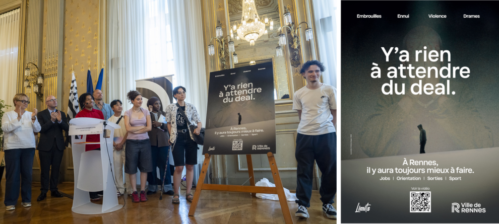 La récente campagne titrée "Y a rien à attendre du deal" a été conçue dans ce cadre, en collaboration avec l'agence rennaise de communication La Contrée, l'association Addictions France, les services municipaux (service Prévention de la Délinquance et Médiation et Direction de la communication) et cinq jeunes orientés par les partenaires locaux notamment la Mission locale (We Ker à Rennes) et les éducateurs de rue. Au terme d'un processus original de création de plusieurs mois, l'agence La Contrée et les 5 jeunes Rennaises et Rennais associés ont réalisé un court film vidéo sans concession et créé une affiche type cinéma pour annoncer la sortie du film.